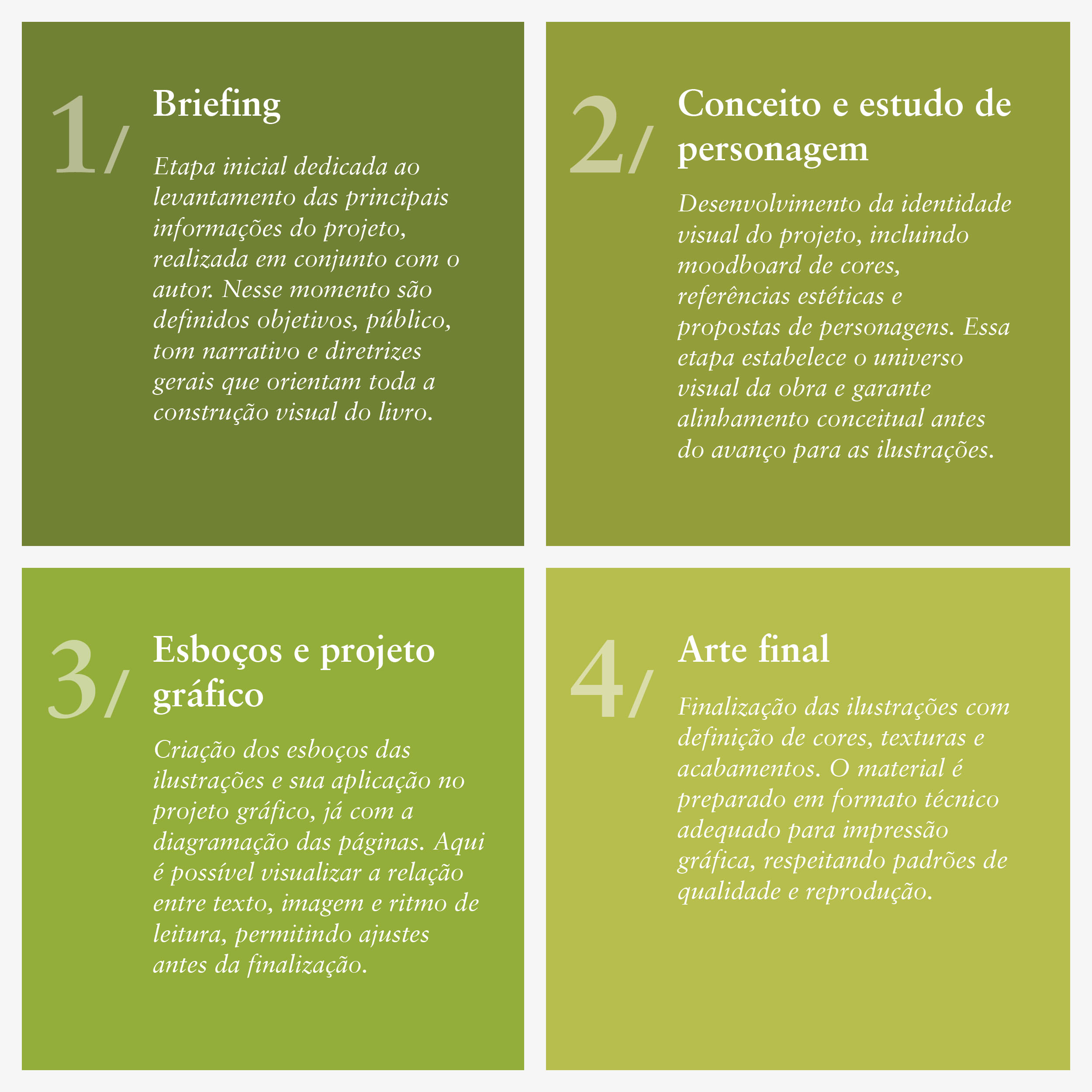 O desenvolvimento do projeto seguiu uma metodologia própria, aplicada em trabalhos com autores, clientes e editoras, garantindo clareza de prazos, alinhamento de expectativas e um padrão elevado de qualidade.