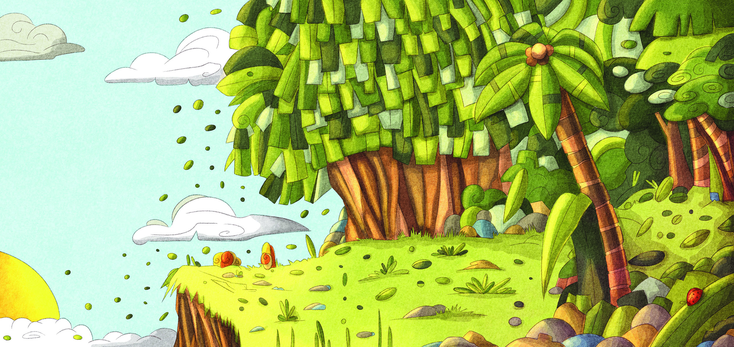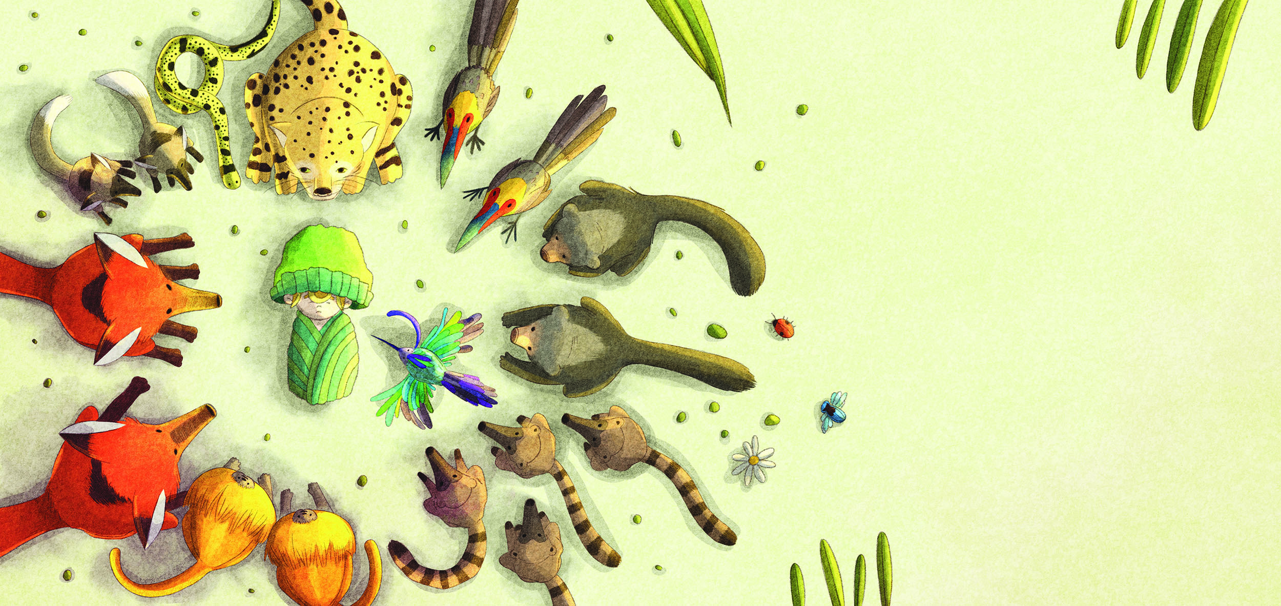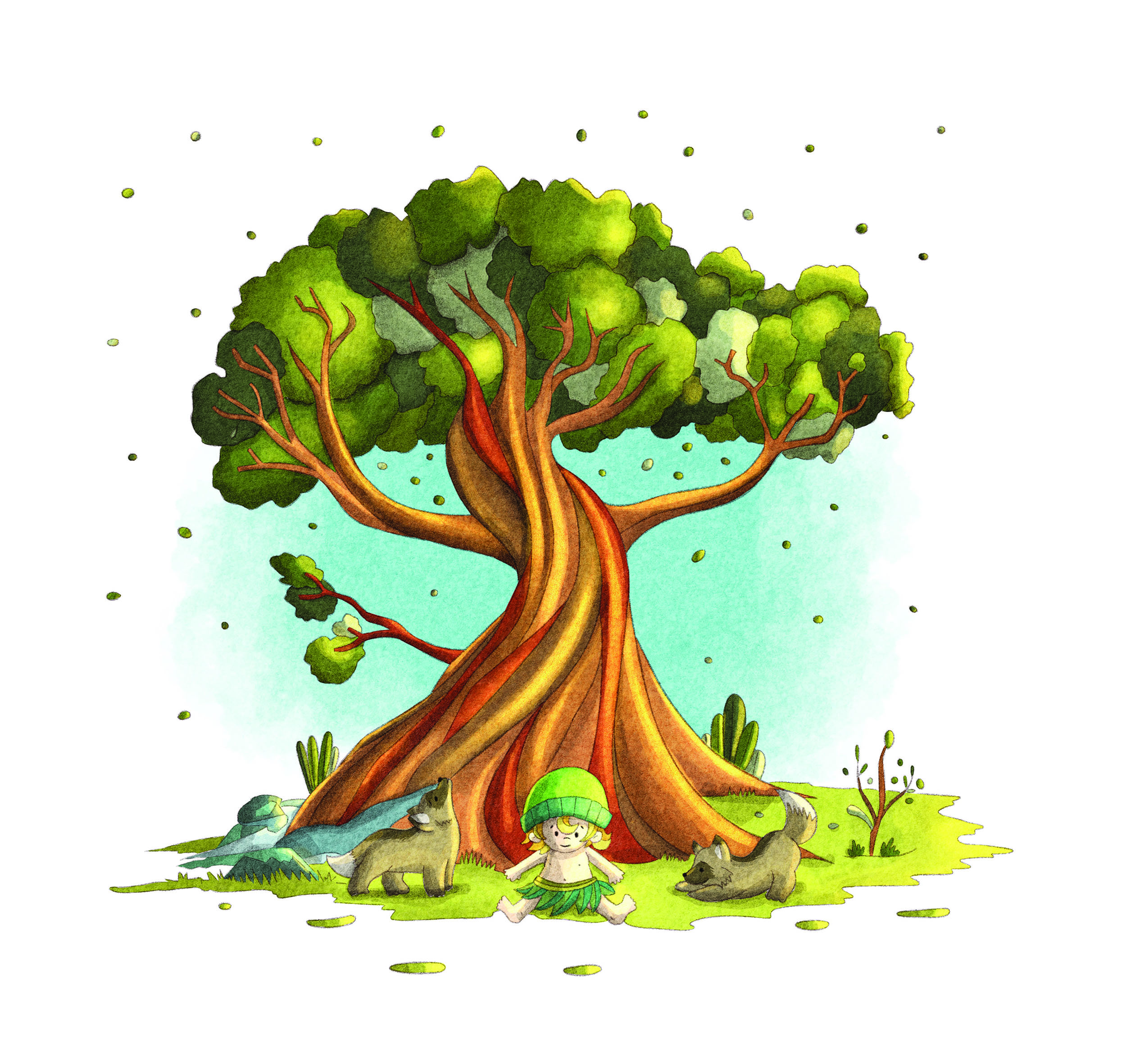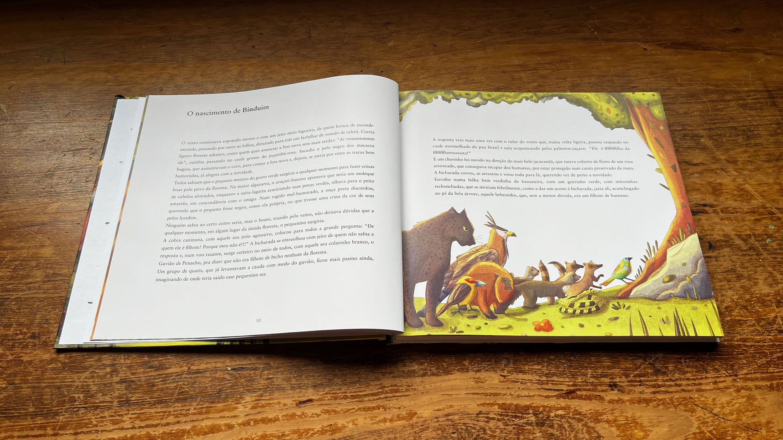 Binduim cresce em meio à floresta, cercado por natureza, afeto e liberdade. Esse é o seu primeiro mundo: quente, vivo, acolhedor e marcado por uma diversidade exuberante de cores, formas e vida.
