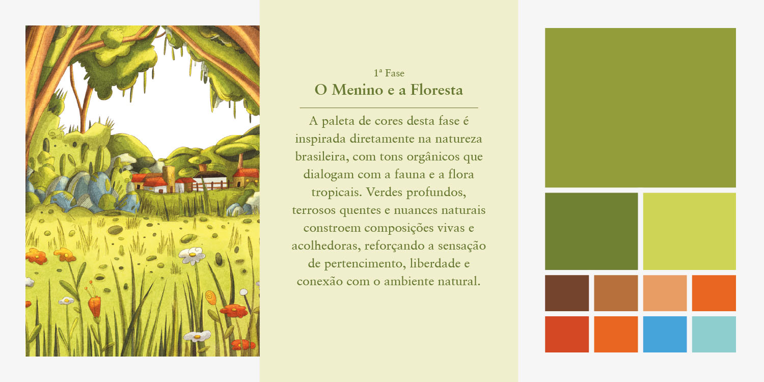 Início — Floresta: predominância de cores quentes e naturais, como verdes profundos, tons terrosos e nuances solares, representando acolhimento, pertencimento e alegria.
