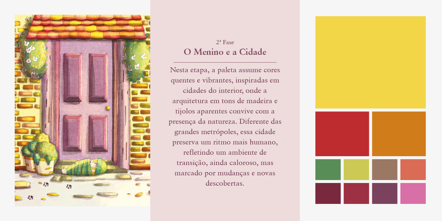Transição — Cidade: cores mais vivas e contrastantes, refletindo o impacto da mudança, o dinamismo urbano e a sensação de deslocamento.