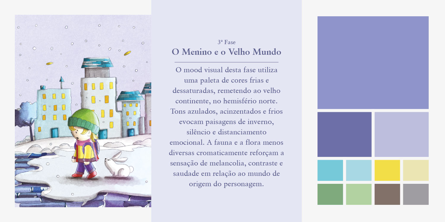 Final — País frio: paleta de cores frias, com azuis, cinzas e tons dessaturados, traduzindo a melancolia, a distância emocional e a saudade da terra natal.
