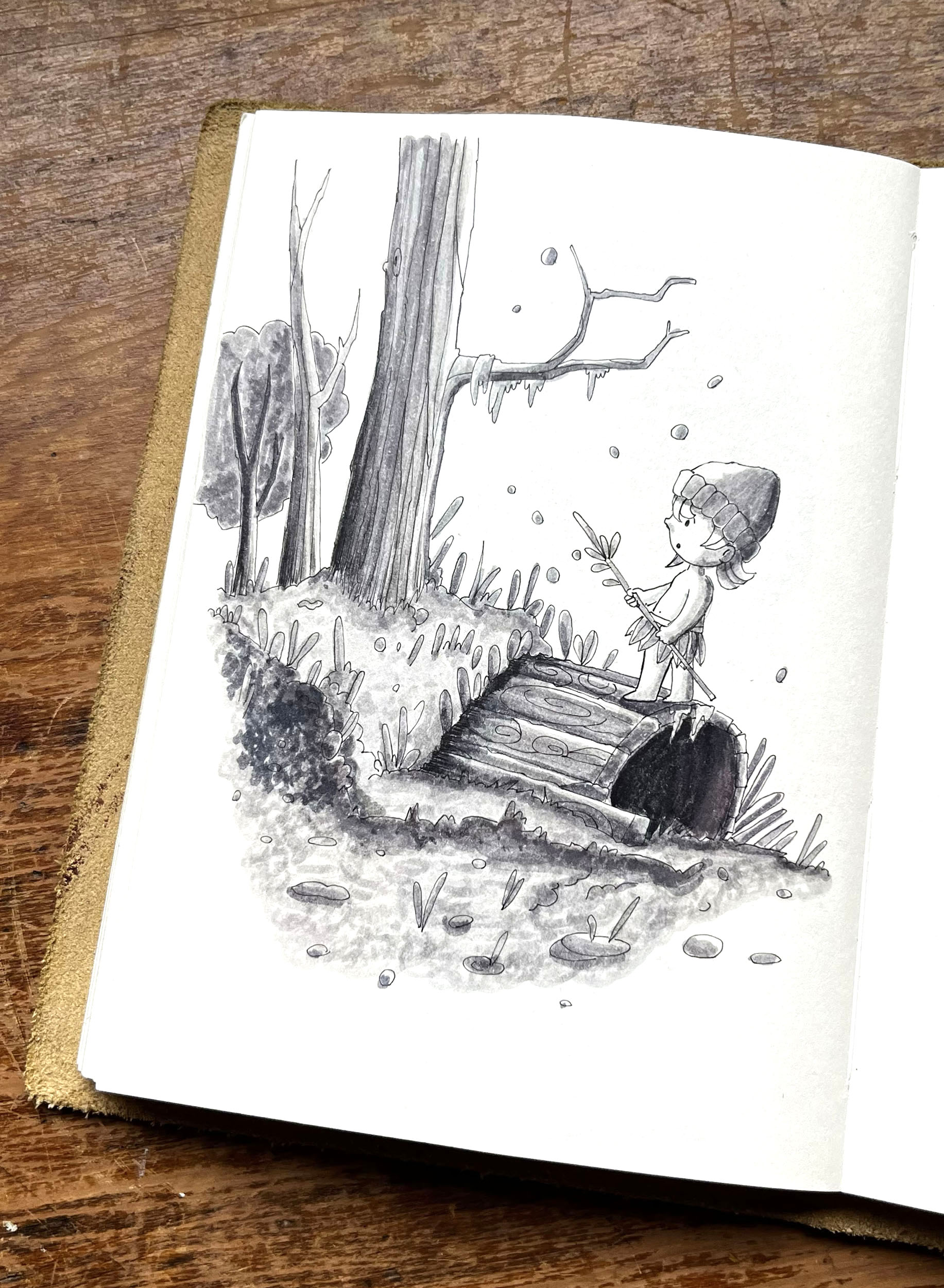 O traço busca equilíbrio entre delicadeza e expressividade, com atenção especial às expressões do personagem, aos gestos sutis e aos elementos simbólicos da natureza, como penas, animais e paisagens, que reforçam o universo poético da obra.